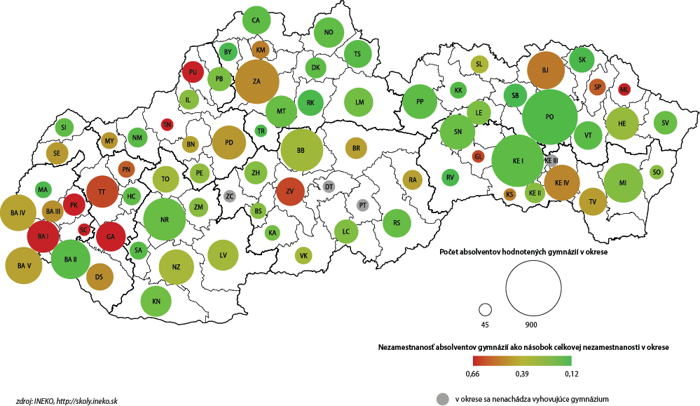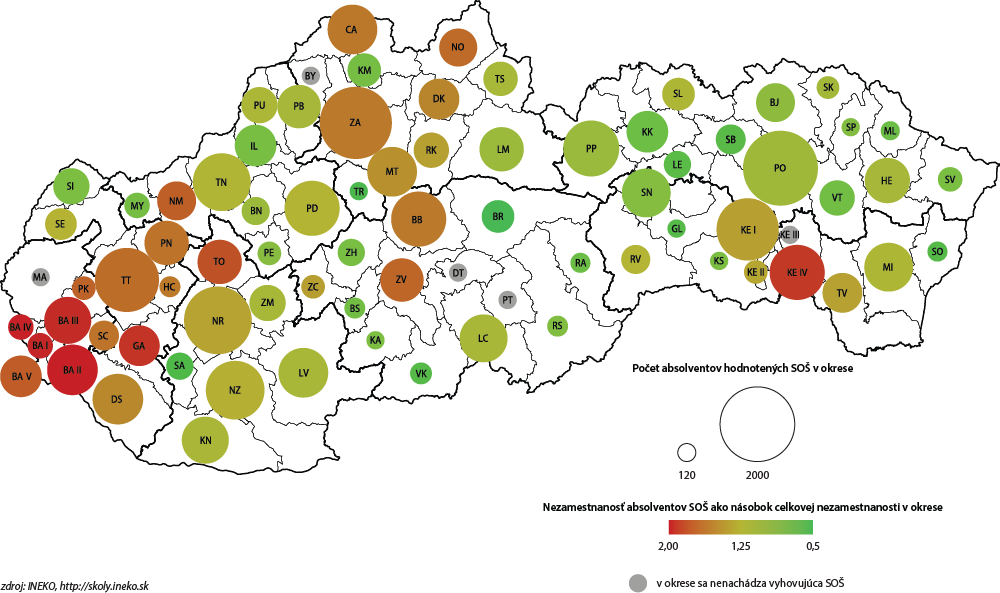 Pomer nezamestnanosti absolventov všetkých hodnotených škôl v okrese a celkovej nezamestnanosti v okrese