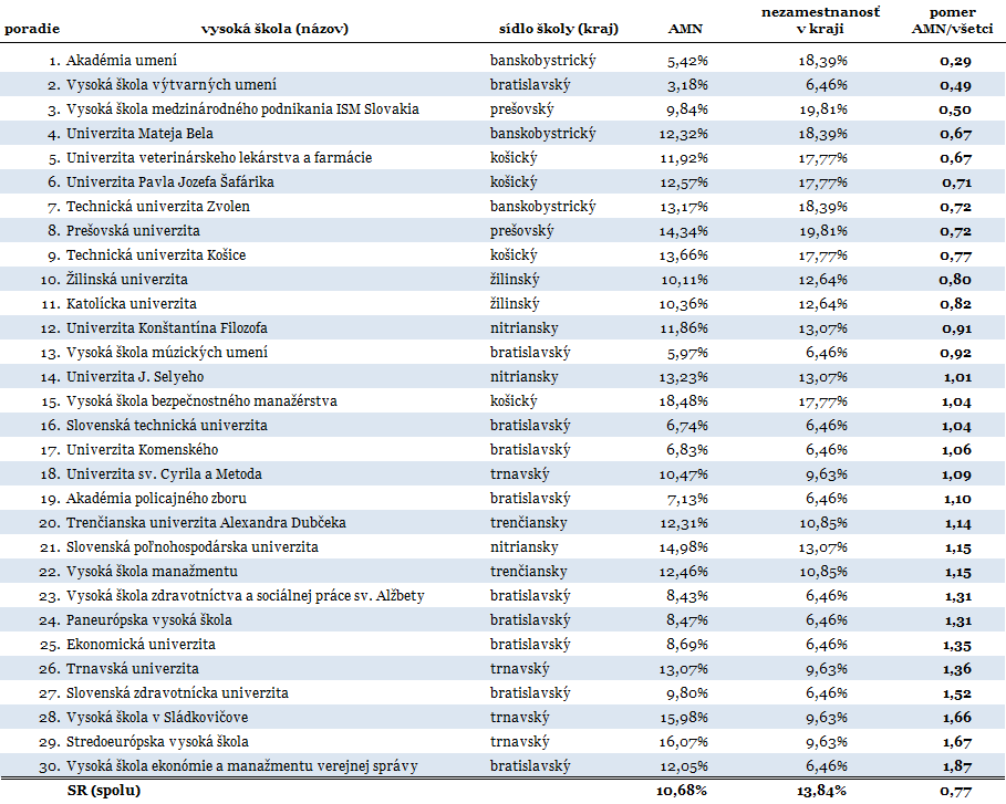 pomer absolventskej miery nezamestnanosti (AMN) vysokej školy a celkovej miery evidovanej nezamestnanosti v kraji sídla školy