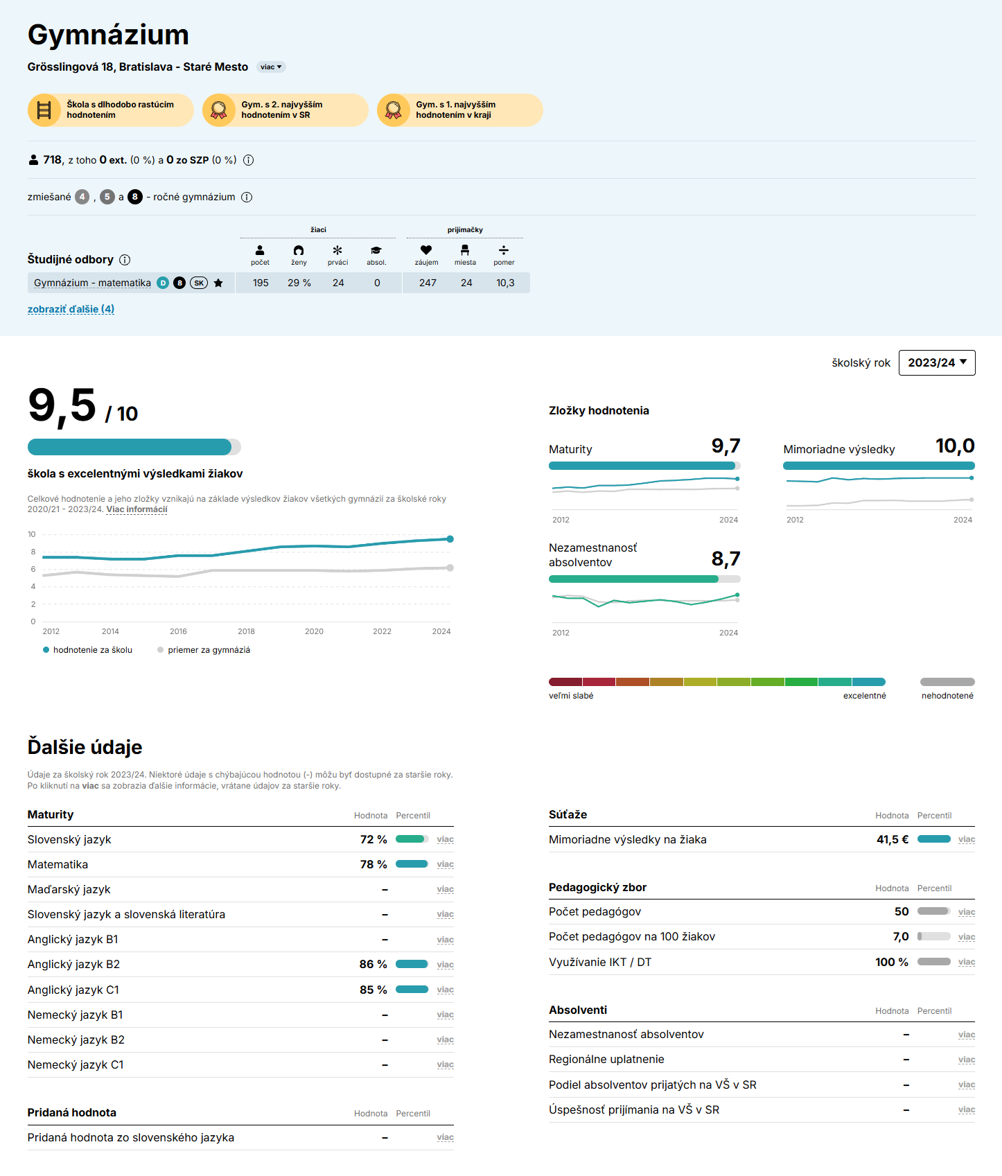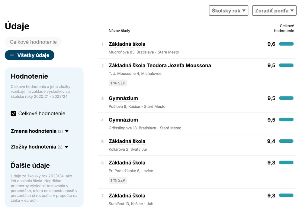 Hodnotenie výsledkov žiakov školy je vypočítané pri základných školách na základe výsledkov celonárodných testov v 5. a 9. ročníku (Testovanie 5, Testovanie 9) a mimoriadnych výsledkov žiakov vo vybraných súťažiach; pri gymnáziách a SOŠ ide o externú časť a písomnú formu internej časti maturít, mimoriadne výsledky žiakov a nezamestnanosť absolventov, pričom mimoriadne výsledky žiakov sú v oboch prípadoch reprezentované objemom finančných prostriedkov pridelených školám na základe dosiahnutých mimoriadnych výsledkov žiakov vo vybraných súťažiach, predmetových olympiádach, medzinárodných projektoch a programoch (výber zostavuje ministerstvo školstva; nie sú zahrnuté platené súťaže organizované súkromnými firmami). Nezamestnanosť absolventov má v hodnotení pri SOŠ vyššiu váhu než v prípade gymnázií, pretože absolventi gymnázií zväčša pokračujú v štúdiu na vysokých školách.